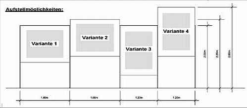 | Variante 1 Stellwandhöhe: 2,00m Stellwandbreite: 1,60m Tafelhöhe: 1,20m Tafelbreite: 1,60m | Variante 2 Stellwandhöhe: 2,20m Stellwandbreite: 1,60m Tafelhöhe: 1,20m Tafelbreite: 1,60m | Variante 3 Stellwandhöhe: 2,00m Stellwandbreite: 1,20m Tafelhöhe: 1,60m Tafelbreite: 1,20m | Variante 4 Stellwandhöhe: 2,60m Stellwandbreite: 1,20m Tafelhöhe: 1,60m Tafelbreite: 1,20m |
