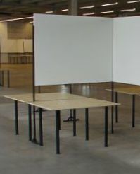 Unsere Modelltische haben eine Tischfläche von 1,25m x 1,00m und eine Höhe von ca. 0,73m. Die Füße in Stahlrohr sind passend zu den Füßen der Stellwände schwarz lackiert. Die Tischflächen sind in neutraler OSB -Holzoptik.Bei sehr kleinen Modellen und beidseitiger Nutzung der Stellwände besteht die Möglichkeit, einen Tisch unter der Stellwand halb hindurchzuschieben, sodass dann beidseitig eine Fläche von ca. 1,00m x 0,60m zur Verfügung steht.